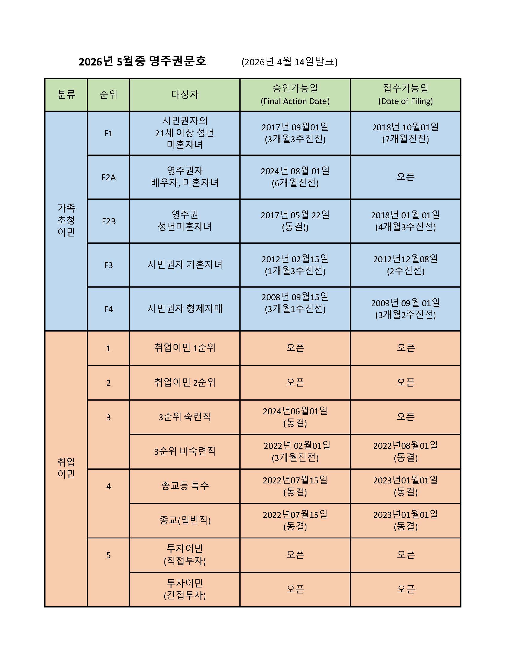 2026년 5월의 영주권 문호에서 시민권자의 21세이상 성년미혼자녀들이 대상인 가족이민 1순위는 승인가능일 (Final Action Date) 이 2017년 9월 1일로 3개월 3주 진전되었으며, 접수가능일 (Filing Date)은 2018년 10월 1일로 7개월진전 되었습니다.