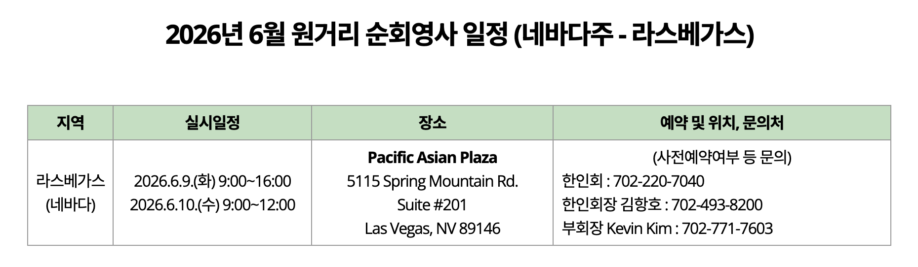 2026년 라스베가스 순회영사 일정